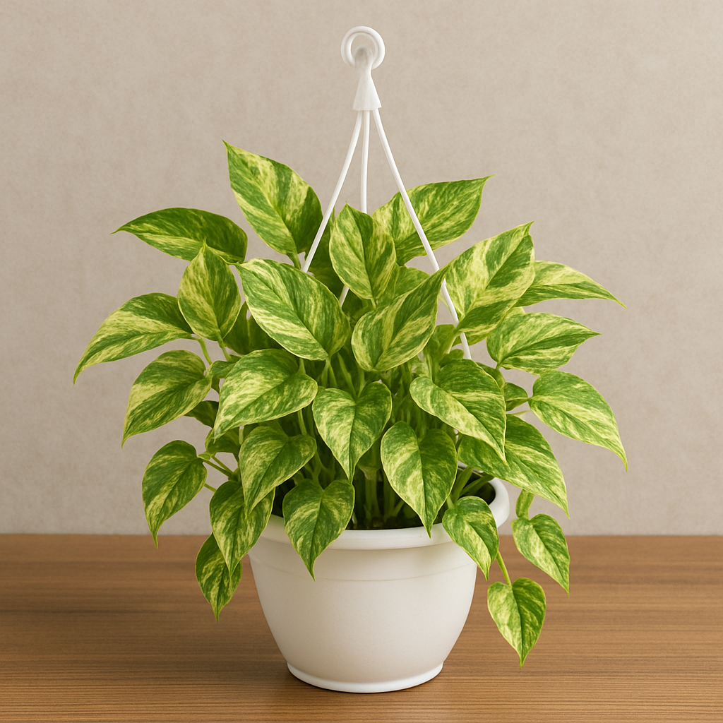 Add a touch of elegance and freshness to your home with the stunning Marble Prince Money Plant, also known as Scindapsus N’Joy. This unique variety of pothos features beautifully variegated green and white marble-like leaves that gracefully trail down from its hanging basket. Known for being both low-maintenance and air-purifying, it’s ideal for indoor décor, balconies, and shaded patios.